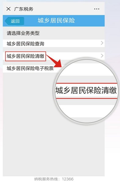 进入“广东税务”公众号“【微办税】--【个人业务】--【城乡居民保险】--【城乡居民保险清缴】。具体操作流程如下图所示: