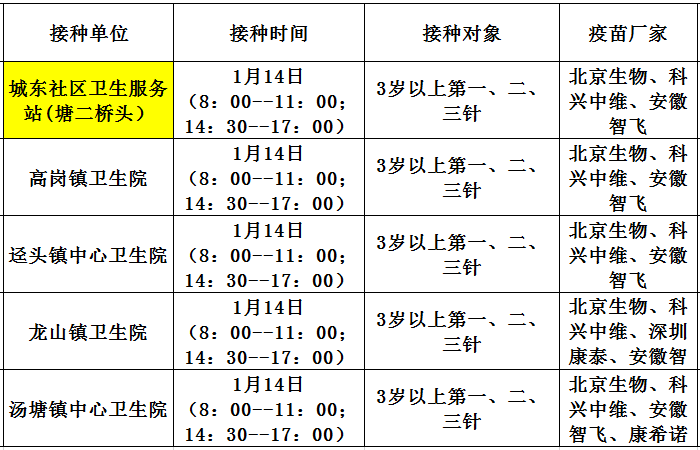 1月14日,佛冈县开放新冠病毒疫苗接种门诊有: