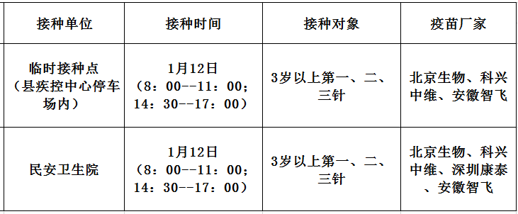1月12日,佛冈县开放新冠病毒疫苗接种门诊有: