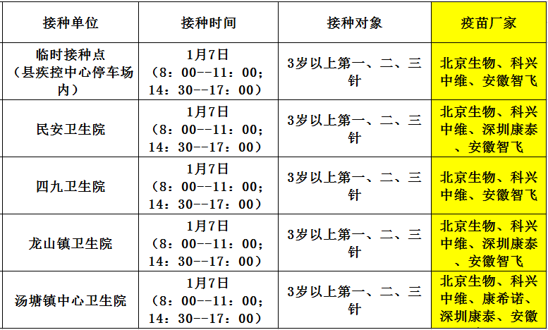 1月7日,佛冈县开放新冠病毒疫苗接种门诊有: