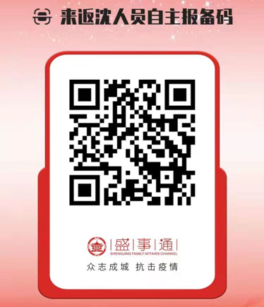 报备要求:所有域外来(返)沈人员抵沈前要下载“盛事通”App、微信小程序搜索“盛事通”或扫描“抵沈人员自主报备”二维码,提前1天向属地社区(村)和单位完成自主报备。