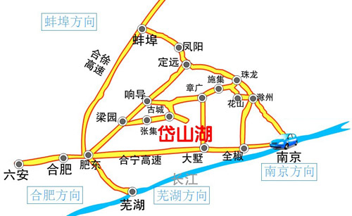 南京--合宁高速--肥东出口--合蚌路--梁园--古城--岱山湖。