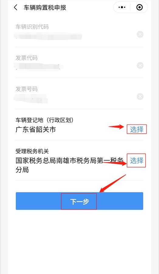 第五步:选择自己车辆登记地及所在税务机关,点击下一步。