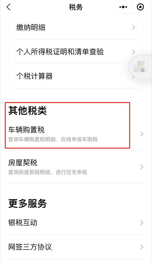 第二步:进入“税务”页面后,下滑,选择“其他税类”→“车辆购置税”