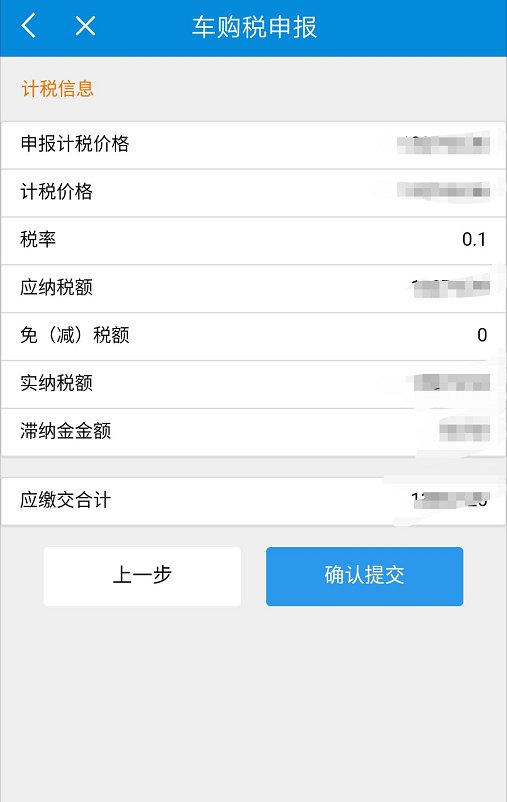 第四步:申报计税页面,确认数据后,点击“确认提交”后点击“我要缴款”,进行车购税税款缴纳。广东税务APP支持多种支付方式。
