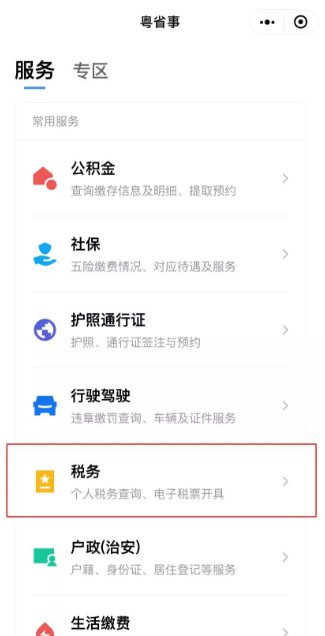 第一步:进入点击“粤省事”小程序,点击“服务”下面的“税务”开始办理相关业务。