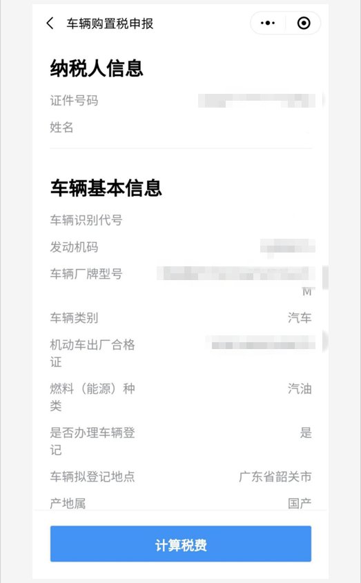 第六步:进入申报信息界面,包括纳税人信息、车辆基本信息和车辆购置信息,请仔细核对,如果信息无误则点击计算税费。
