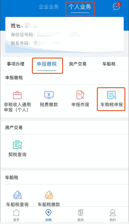②【个人身份】:点击【办税】-【个人业务】-【申报缴税】-【车购税申报】进入申报页面;