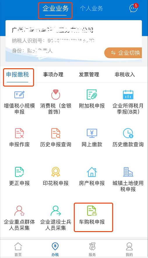 第二步:①【企业身份】:点击【办税】-【企业业务】-【申报缴税】-【车购税申报】进入申报页面;
