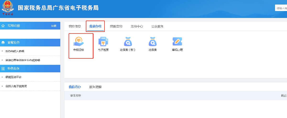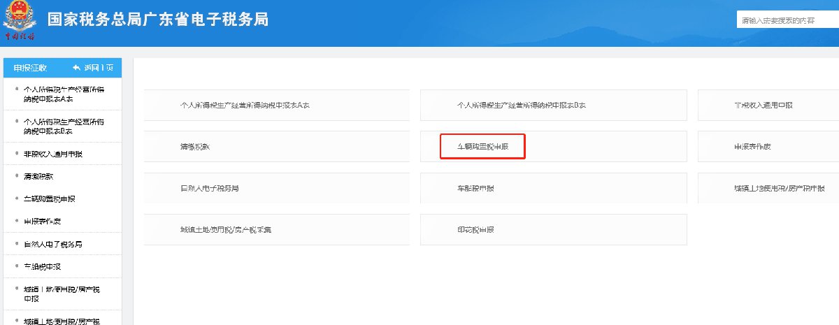 第一步:登陆广东电子税务局网站,输入账户和密码完成登录;在主界面,选择【我要办税】→【申报征收】→【车辆购置税申报】;