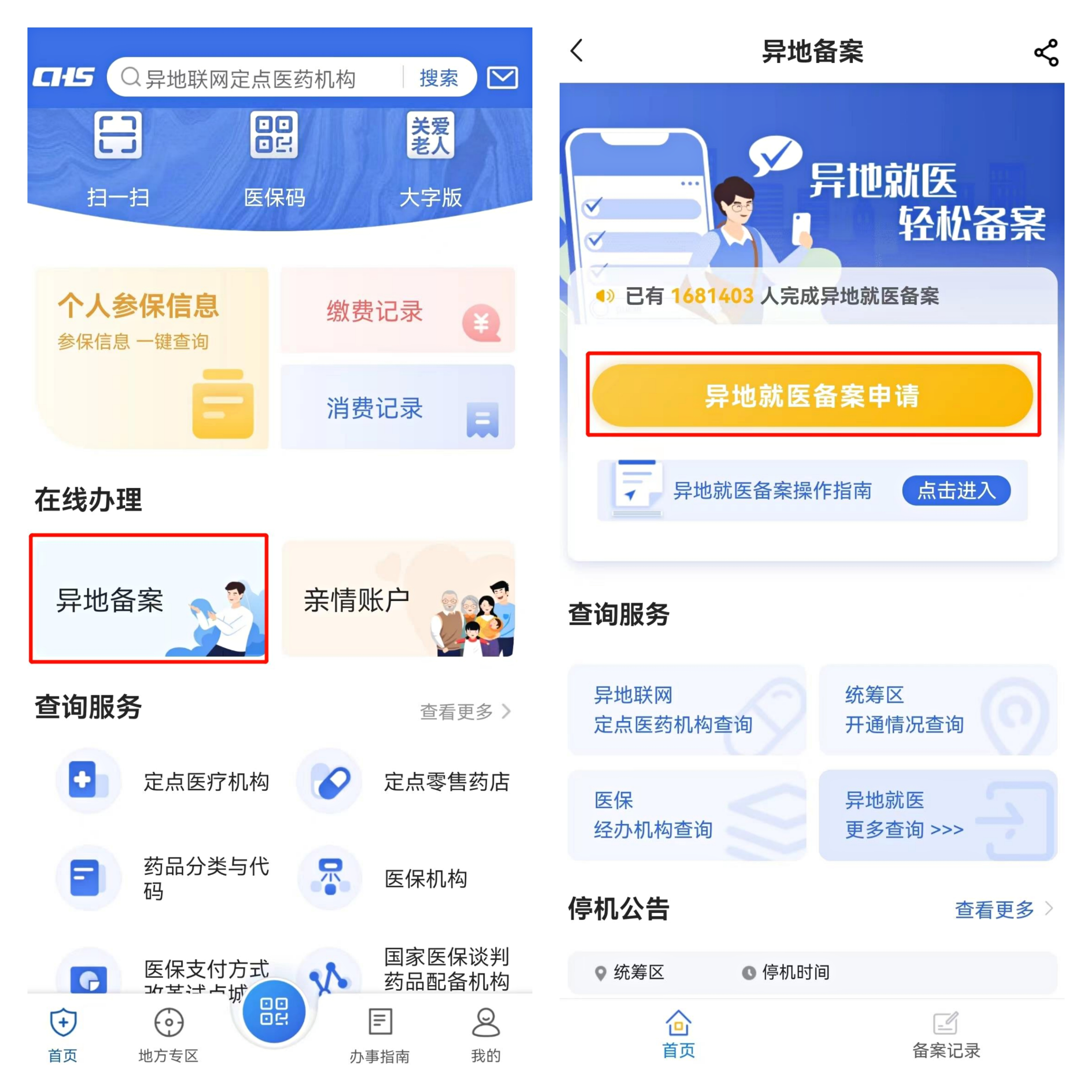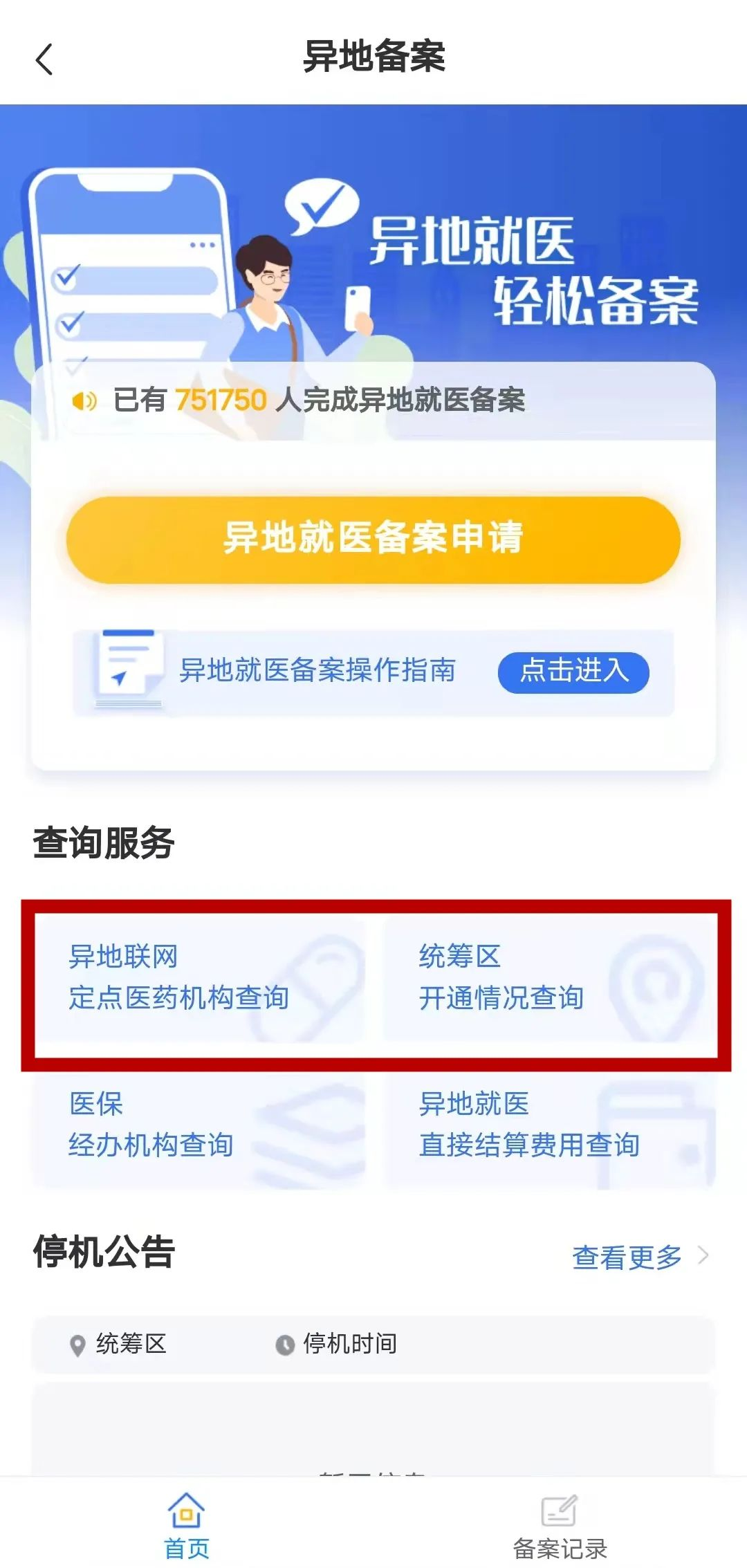异地就医备案办理成功后,参保人员可前往备案就医地所有已开通跨省异地就医联网直接结算功能的医保定点医院就医,在“国家医保服务平台”APP首页“异地备案”页面,可查询统筹地区及定点医疗机构和定点药店的开通情况: