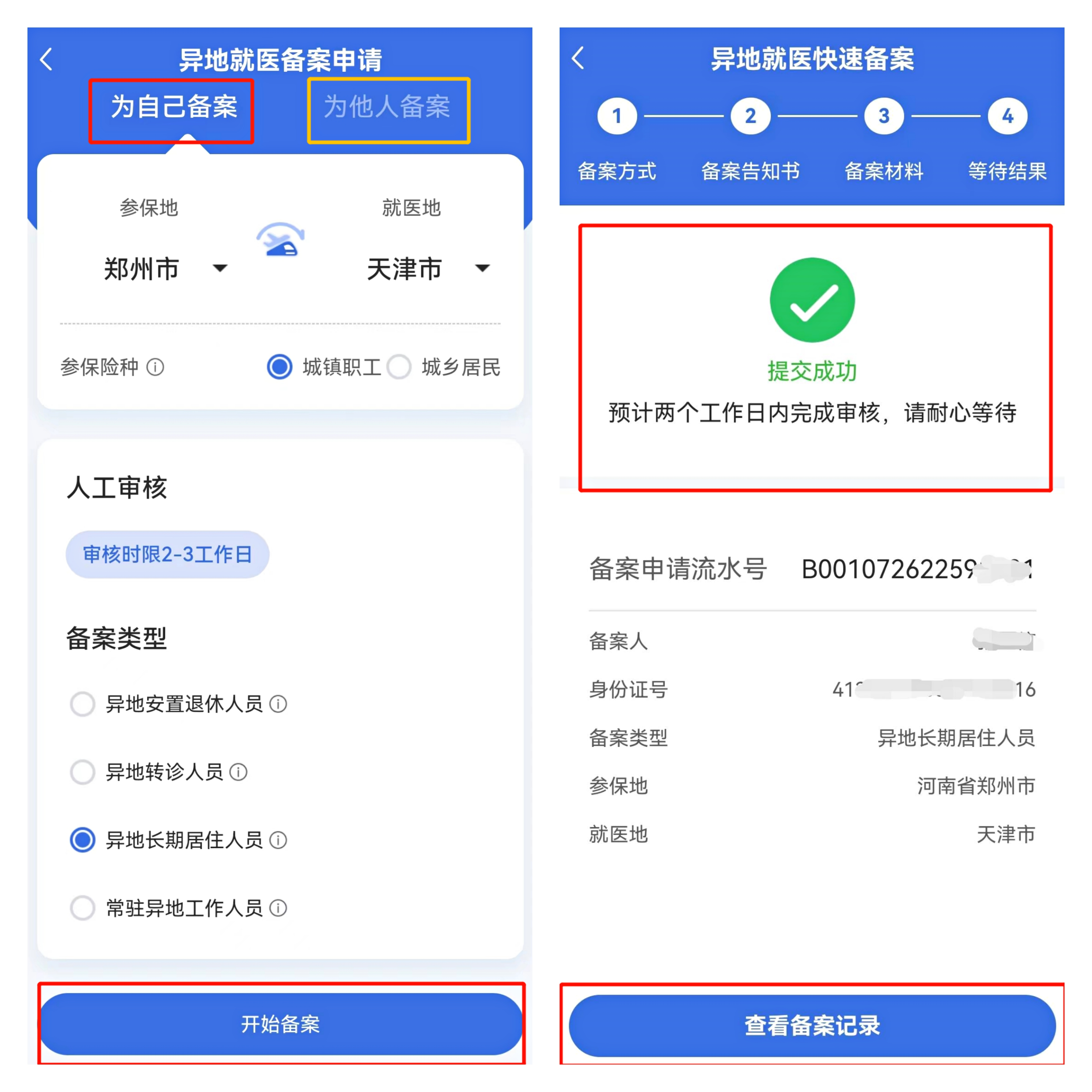 在办理页面可以“为自己备案”,也可以“为他人备案”。根据申请人的实际情况,选择“参保地”、“就医地”、“参保险种”、“备案类型”后,点击【开始备案】,按页面提示进行操作。