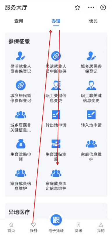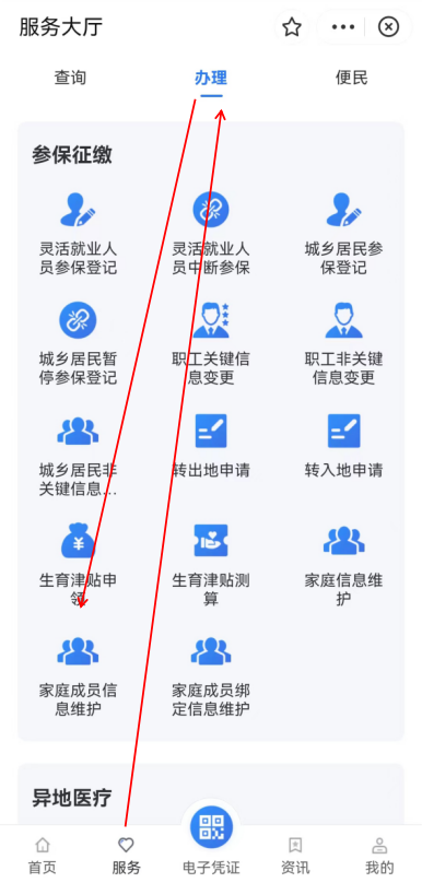 4.绑定账户,点击“服务--办理--家庭成员信息维护”;