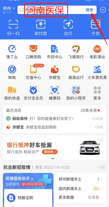 1.建立家庭,打开支付宝,在搜索栏内搜索“河南医保”;