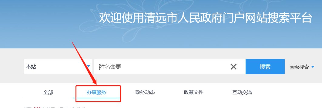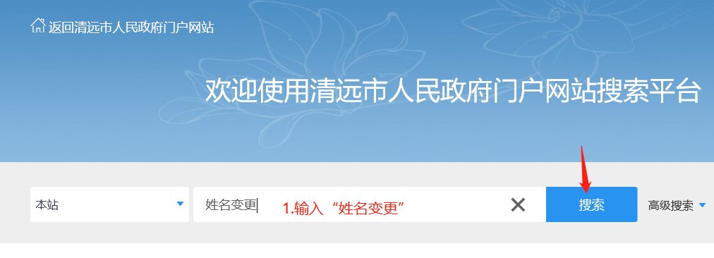 第一步:在清远市人民政府门户网站搜索平台的搜索框中输入“姓名变更”,然后点击“搜索”。