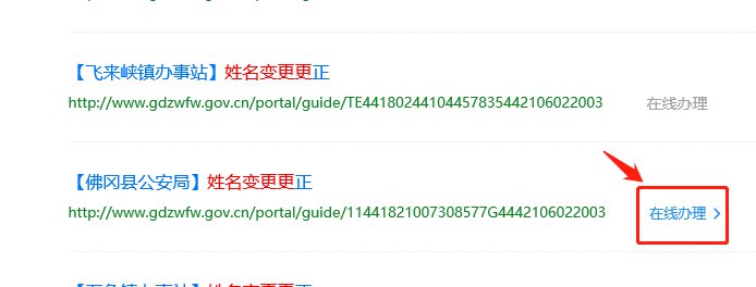 第三步:查看各区县公安局、派出所【姓名变更更正】业务,右边“在线办理”如果是蓝色的,表明可以进行网上申请。