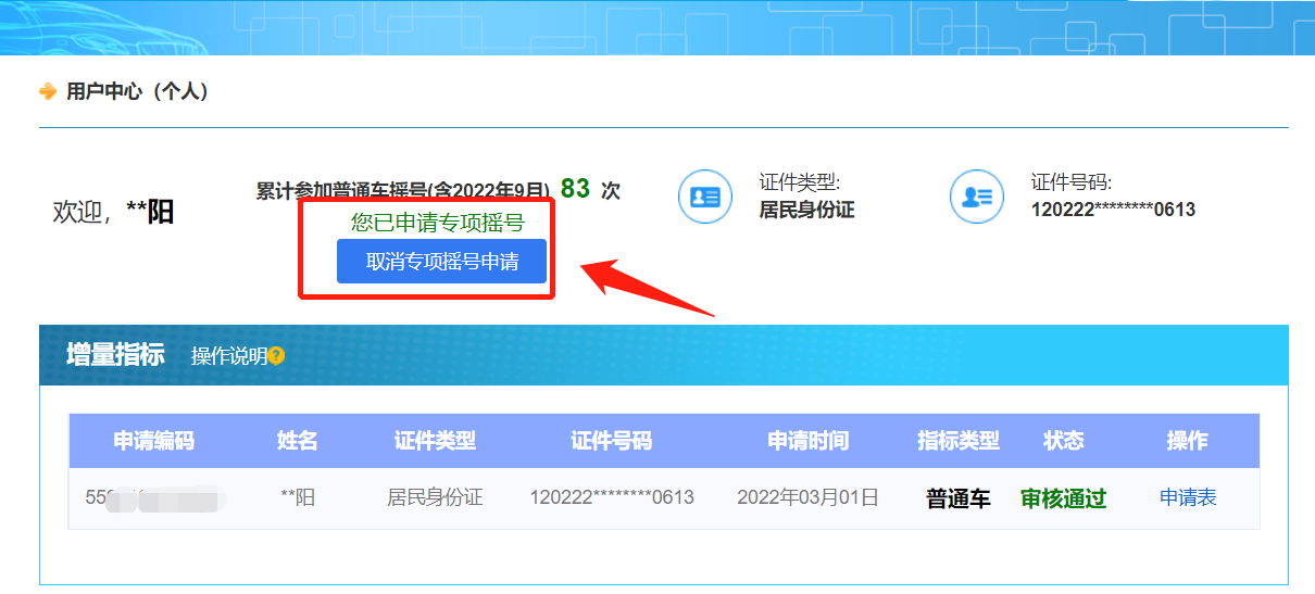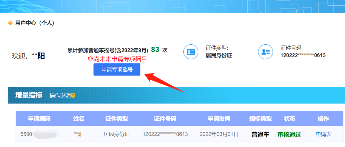 申请流程:登录天津市小客车调控管理信息系统(http://xkctk.jtys.tj.gov.cn/),进入个人用户界面,点击【申请专项摇号】