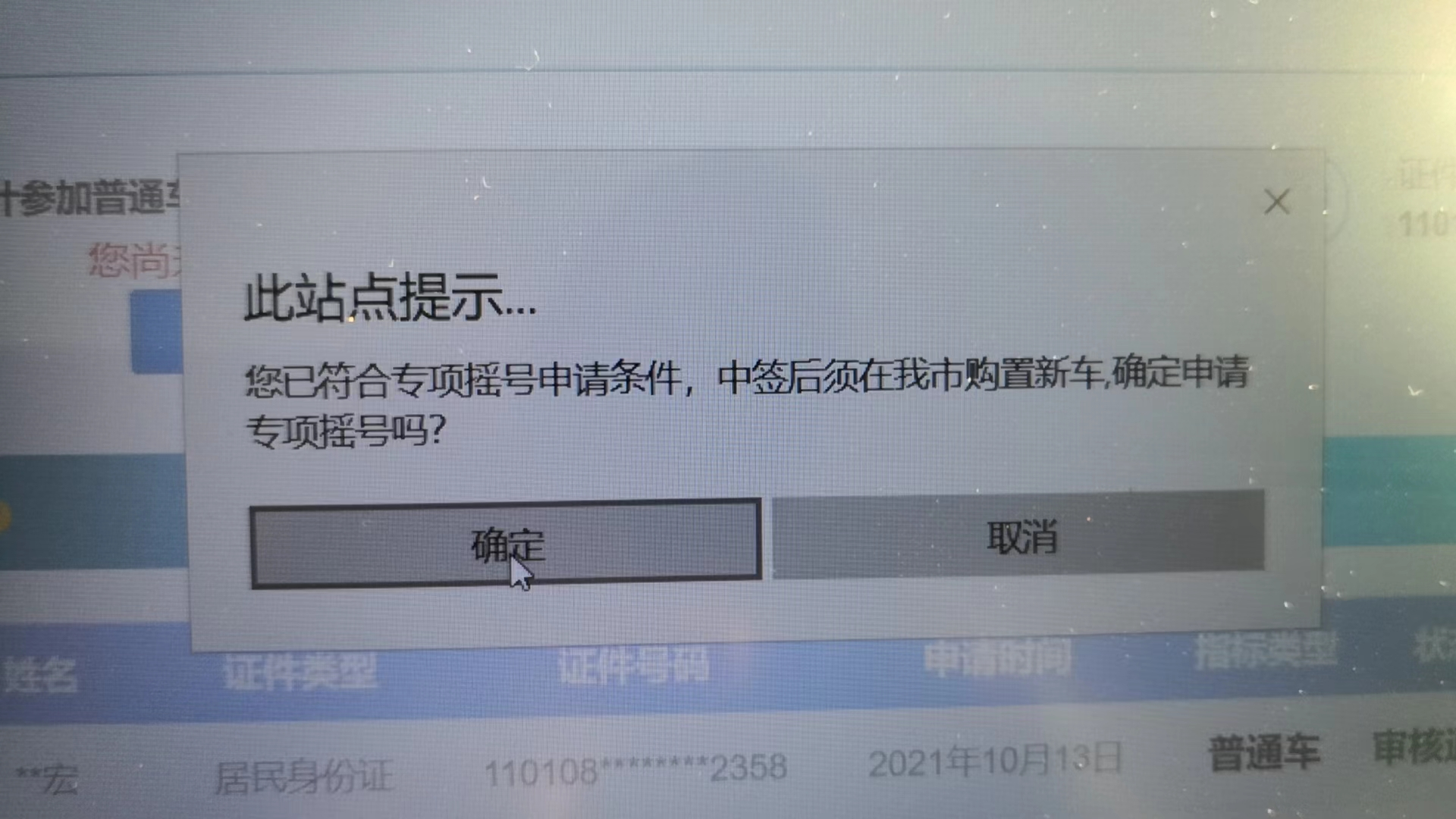 然后会收到一个弹窗,提示中签后要在天津购买新车,点击确定。