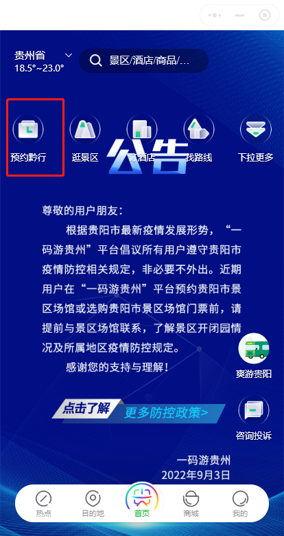1.进入“一码游贵州”微信小程序,在首页选择“预约黔行”板块。