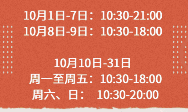 2022年10月1日至10月7日:10点30至21:00.