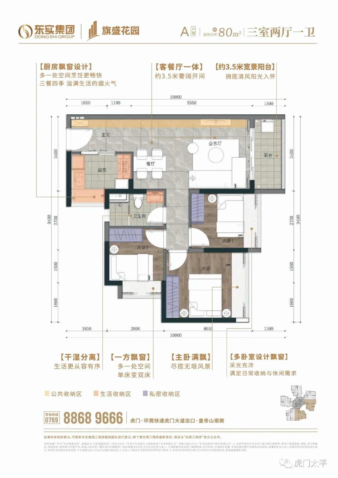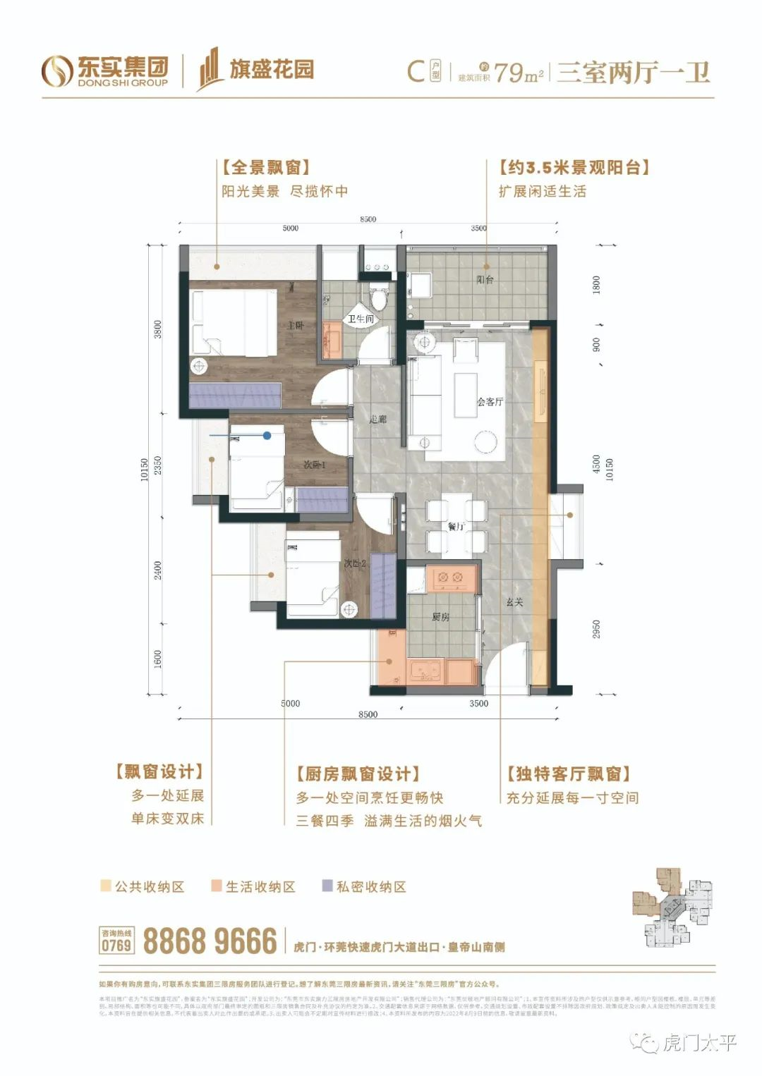 东实旗盛花园为2梯6户设计,均为两室两厅一卫、三室两厅一卫,分71平方米、79平方米、80平方米三种户型。