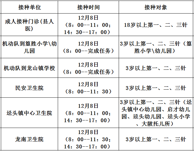 12月8日,佛冈县开放新冠病毒疫苗接种门诊有: