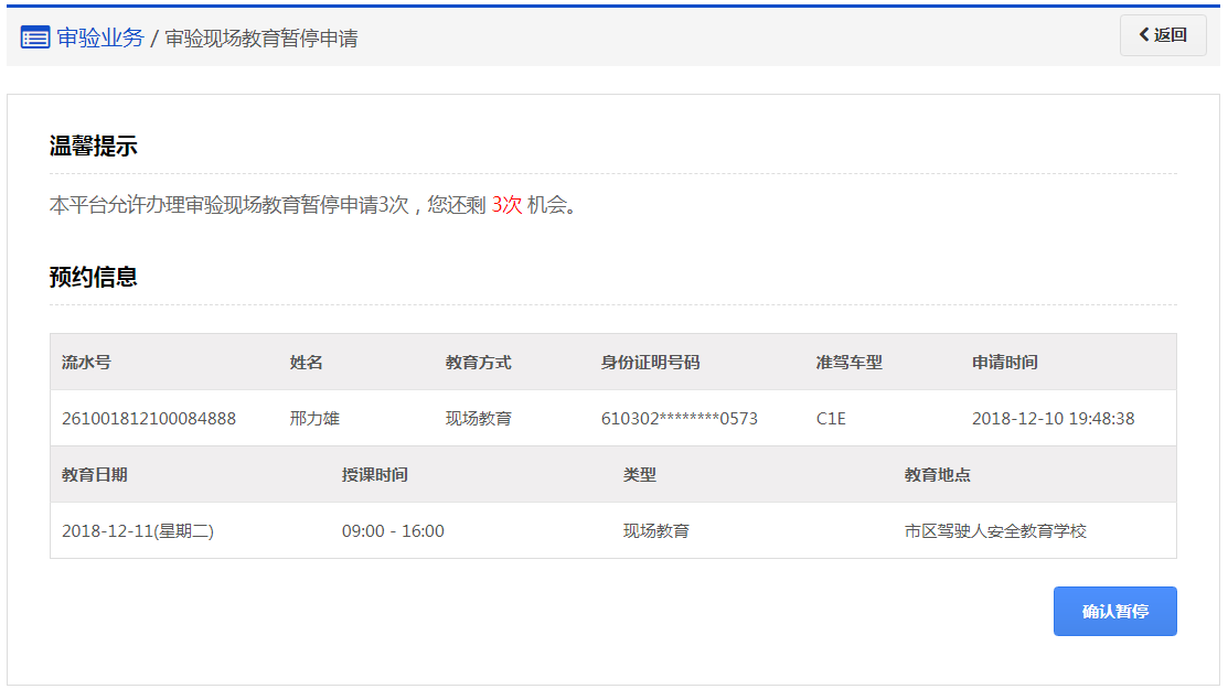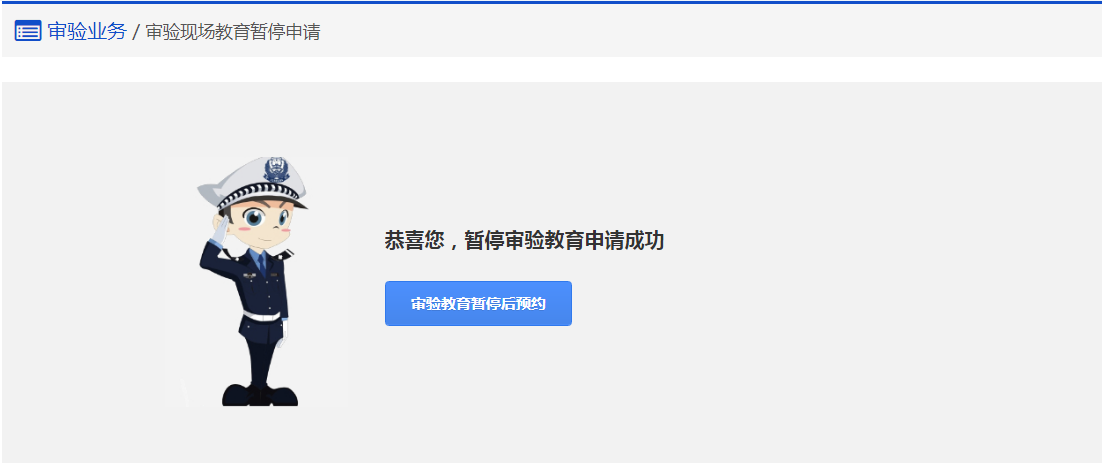 在该步骤,用户可以点击【审验教育暂停后预约】重新预约现场教育