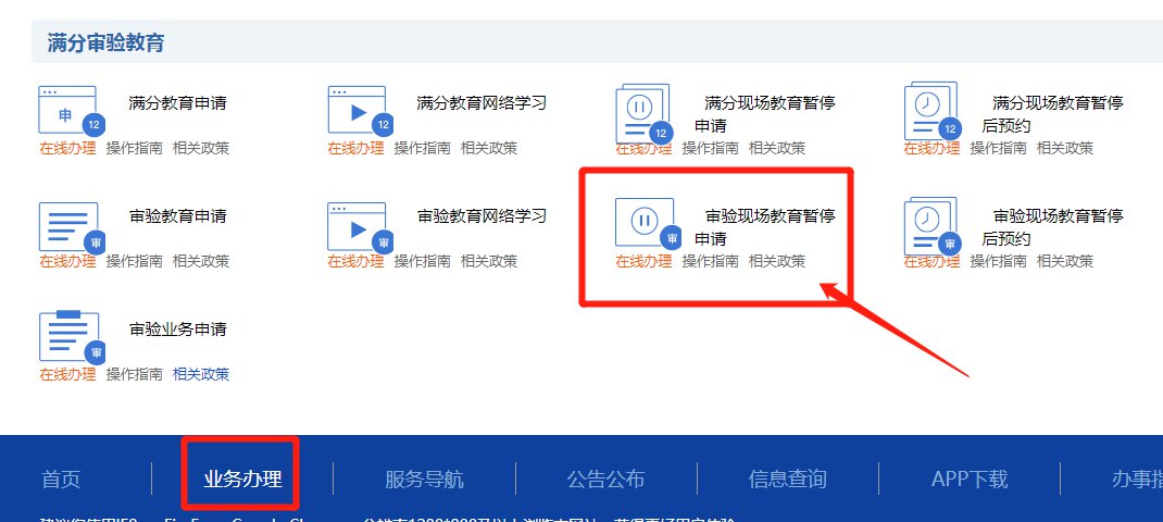 登录交通安全综合服务管理平台,点击【业务办理】→【满分审验教育】→【审验现场教育暂停申请】。