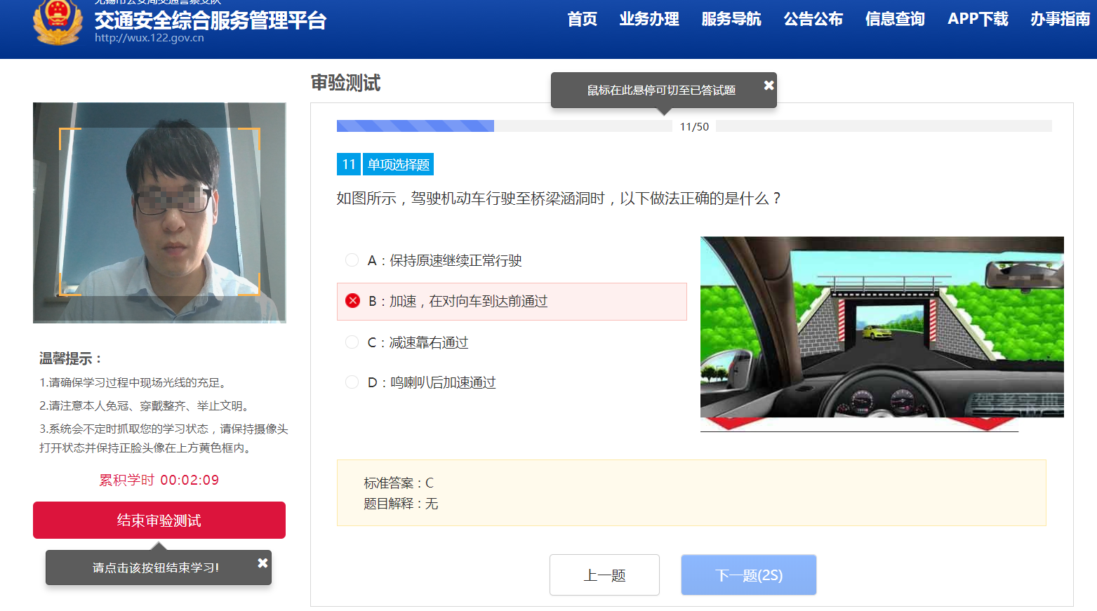 用户点击【开始答题】,进入审验测试界面。请认真阅读提示信息,点击【我知道了】进入步骤2,操作界面如下图所示: