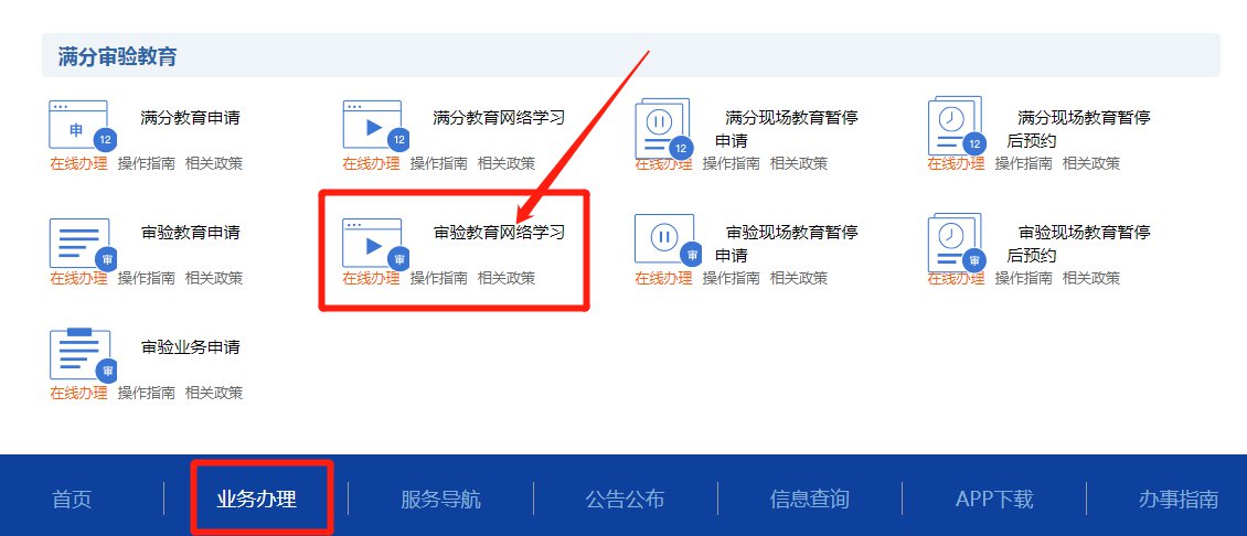 登录交通安全综合服务管理平台,点击【业务办理】→【满分审验教育】→【审验教育网络学习】。