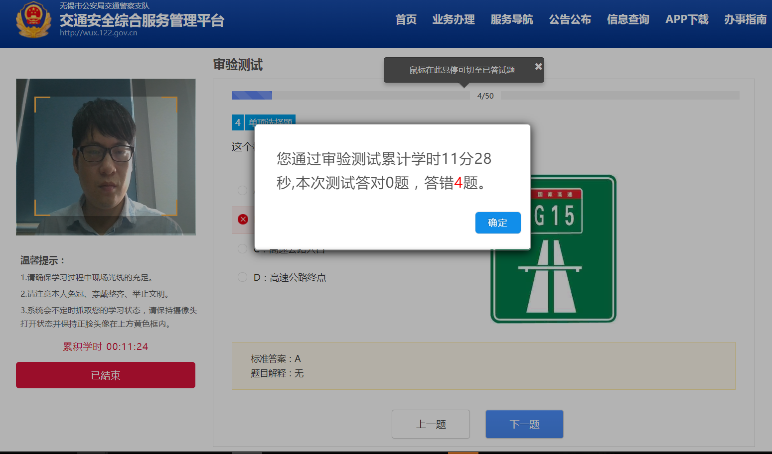 测试过程结束时点击【结束审验测试】,系统停止计时并告知测试结果。测试完成学时不满45分钟可以测试新的试题。