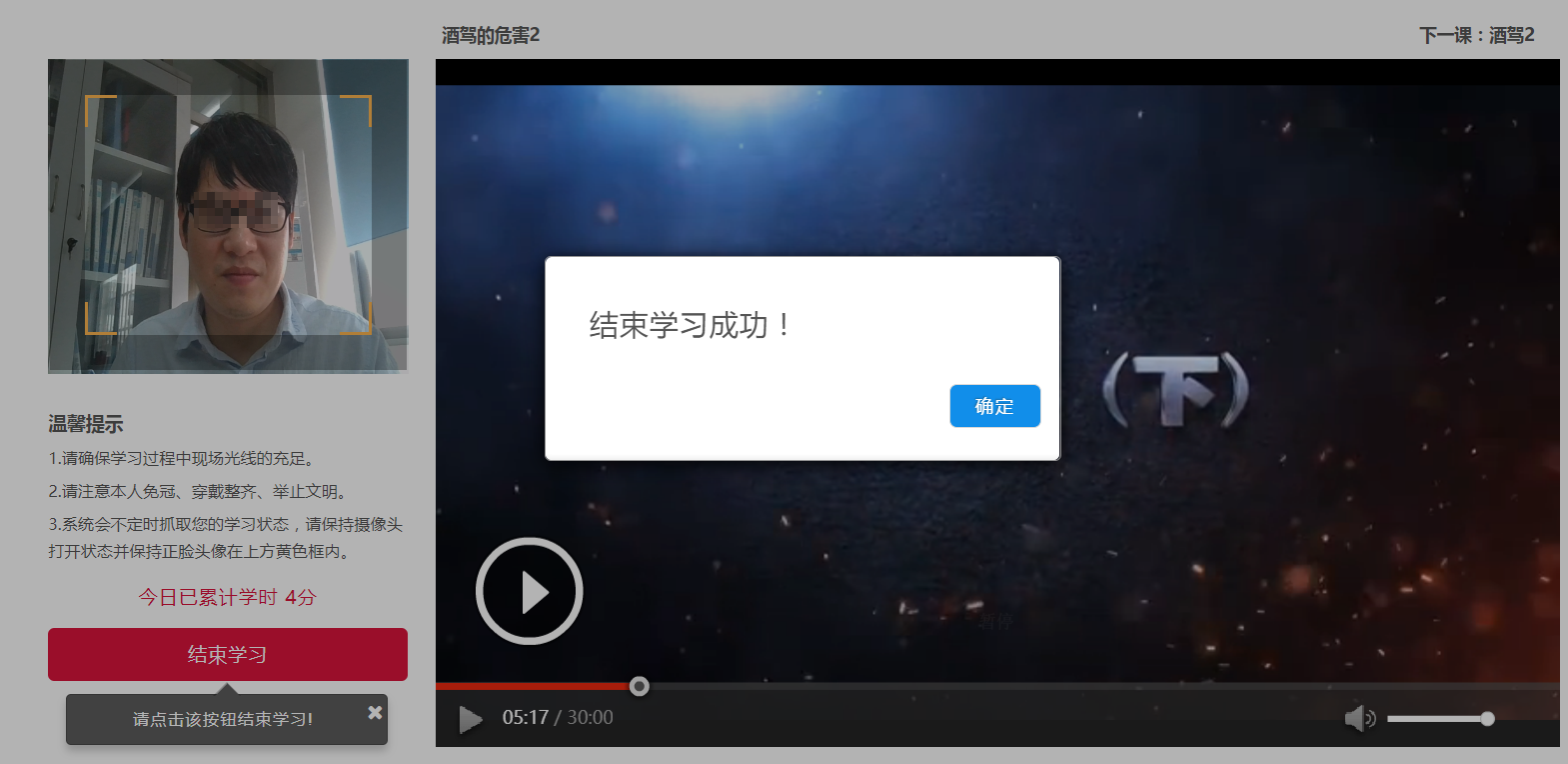 若结束当前课件学习或中途离开,点击【结束学习】结束本次视频学习,操作界面如下图所示: