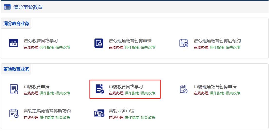 登录交通安全综合服务管理平台,点击【业务办理】→【满分审验教育】→【审验教育网络学习】。