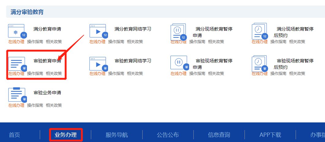 登录交通安全综合服务管理平台,点击【业务办理】→【满分审验教育】→【审验教育申请】。