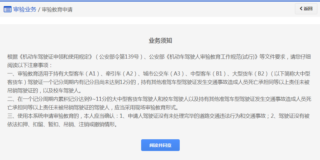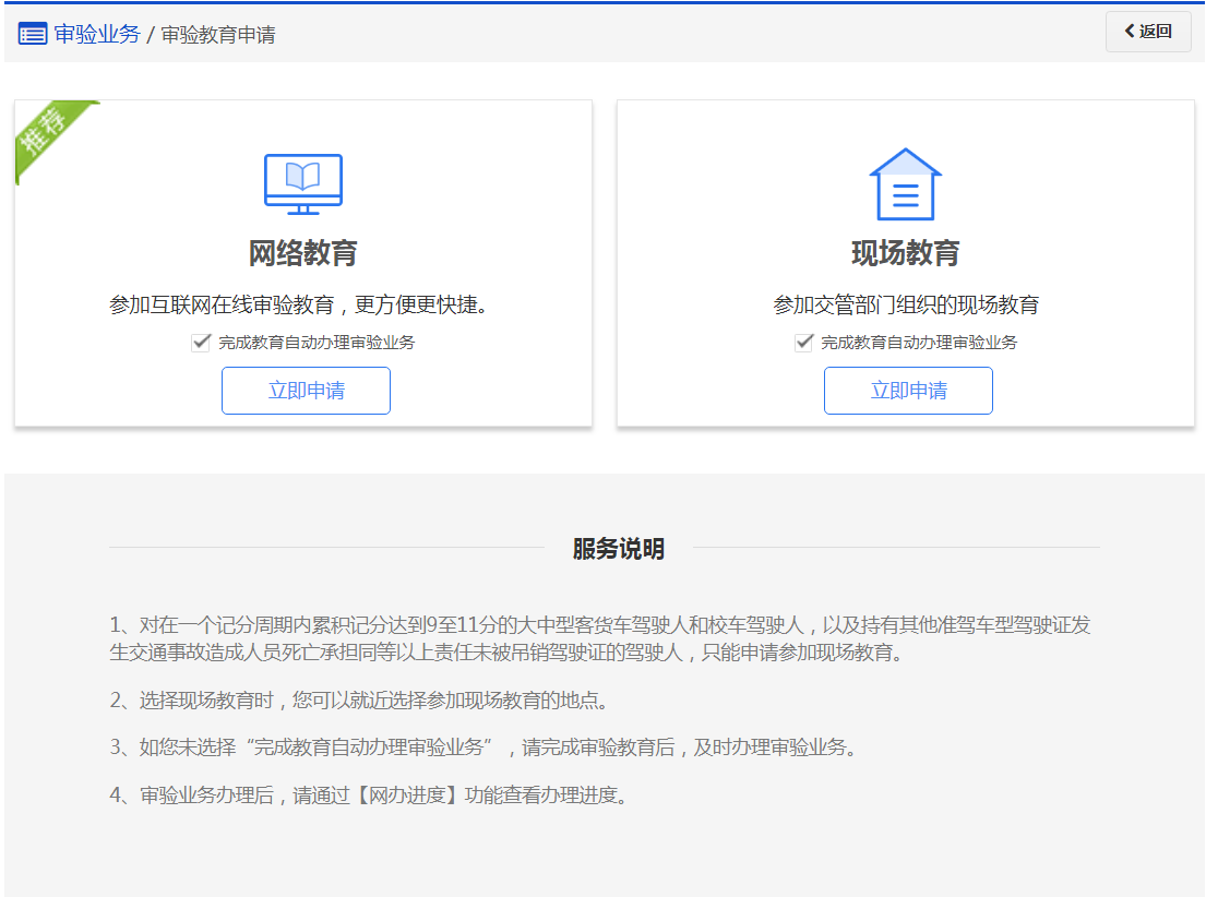 (4)完成审验教育后,若未选择“完成教育后自动办理审验业务”,请及时办理审验业务。 若已选择,系统将自动为您办理审验业务申请,请您在网办进度中关注受理进度,受理结果将以短信告知。