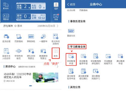 第一步:手机登录“交管12123”进入主页面,点击【更多】,进入业务中心,屏幕下拉在【学习教育业务】选择【审验教育申请】。