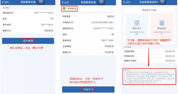 第三步:进入申请界面【提交申请】,申请成功后即可【开始学习】,选择学习内容【课件学习】或【审验测试】并细读“温馨提示”。