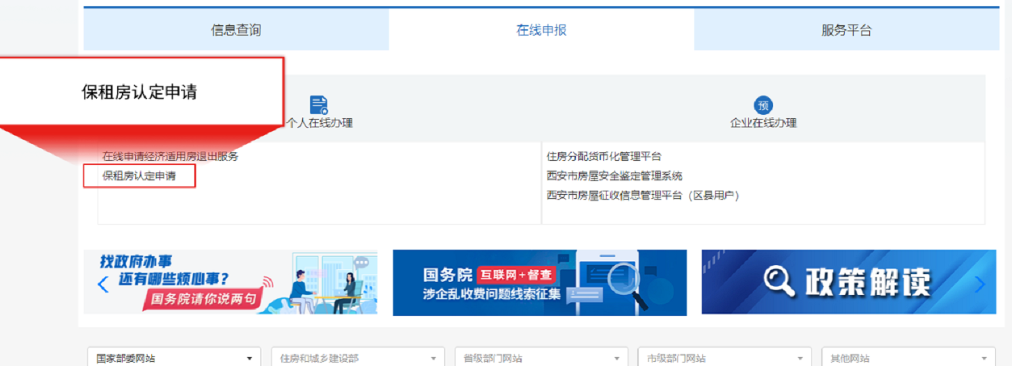 方式1:点击“网站首页——在线申报——个人在线办理——保租房认定申请”进入。