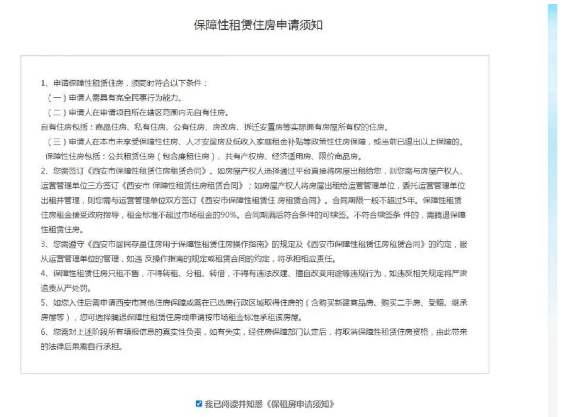 (四)登录后会跳转至“西安市住房租赁交易服务平台——我的申请”页面。详细阅读《保障性租赁住房申请须知》,勾选“我已阅读并知悉”进入申请程序。