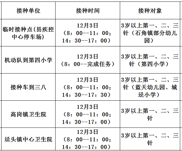 12月3日,佛冈县开放新冠病毒疫苗接种门诊有: