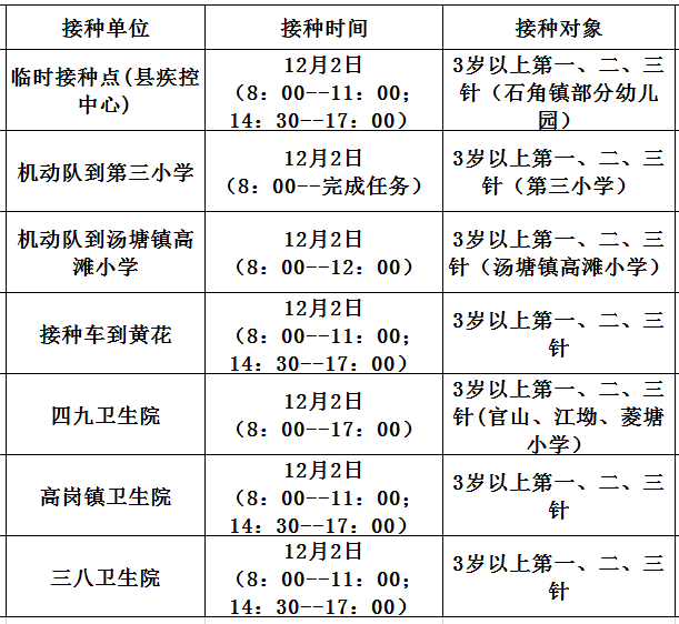 12月2日,佛冈县开放新冠病毒疫苗接种门诊有: