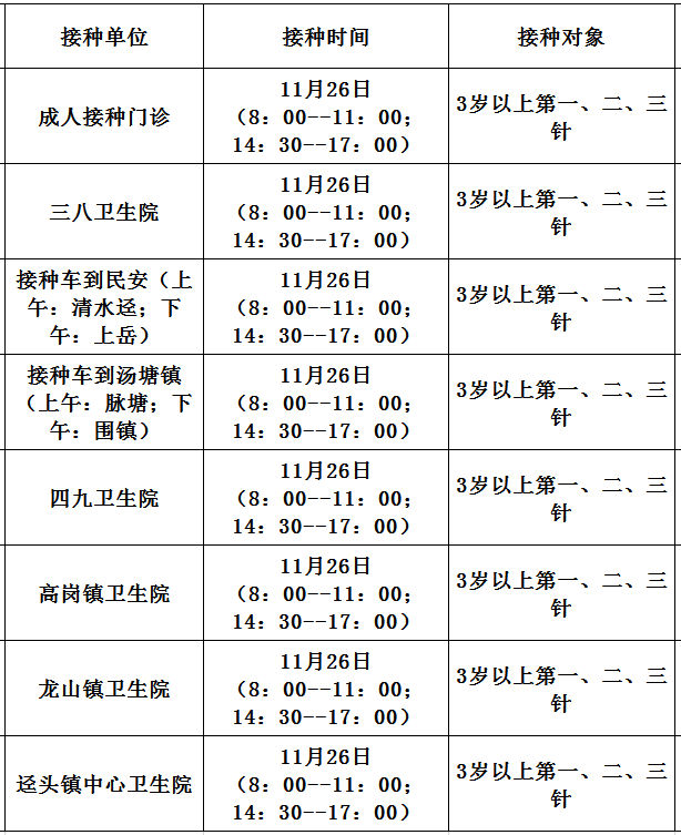 11月26日,佛冈县开放新冠病毒疫苗接种门诊有: