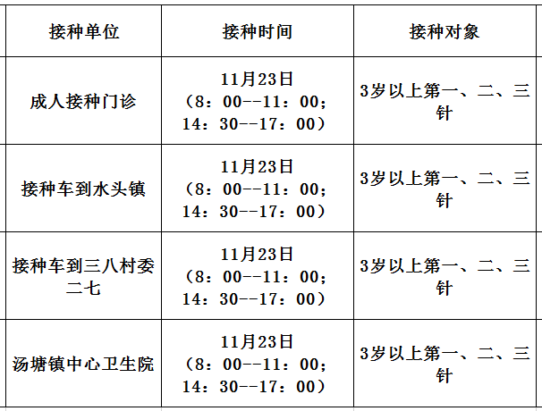 11月23日,佛冈县开放新冠病毒疫苗接种门诊有: