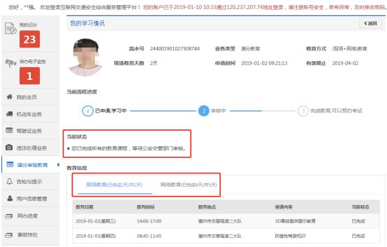 第二步:可查看“现场教育”和“网络教育”学习情况,若“当前状态”为完成的,本人携带有效身份证原件即可前往指定地点办理满分考试预约;若“当前状态”为待审核的,请耐心等待工作人员审核;若“当前状态”为不通过的,请注意查看学习任务是否已完成并按要求完成所有课程,完成后即可进行满分考试预约。