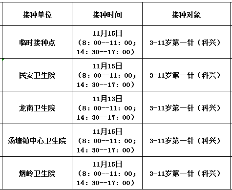 11月15日,佛冈县开放新冠病毒疫苗接种门诊有: