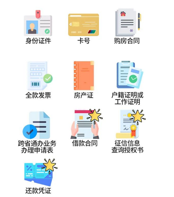 职工身份证件(已婚职工还需提供配偶身份证件及婚姻关系证明)、建设银行Ⅰ类储蓄账户账号(可为住房公积金联名卡储蓄卡号)、购房合同、全款发票、房产证、购房人所购住房座落城市的户籍证明或本市缴存单位出具的工作证明、《跨省通办业务办理申请表》(购房地中心提供)、借款合同、还款凭证、借款人填写的《征信信息查询授权书》(购房地中心提供)(全款购买外地住房提取无需提供后三项要件)。