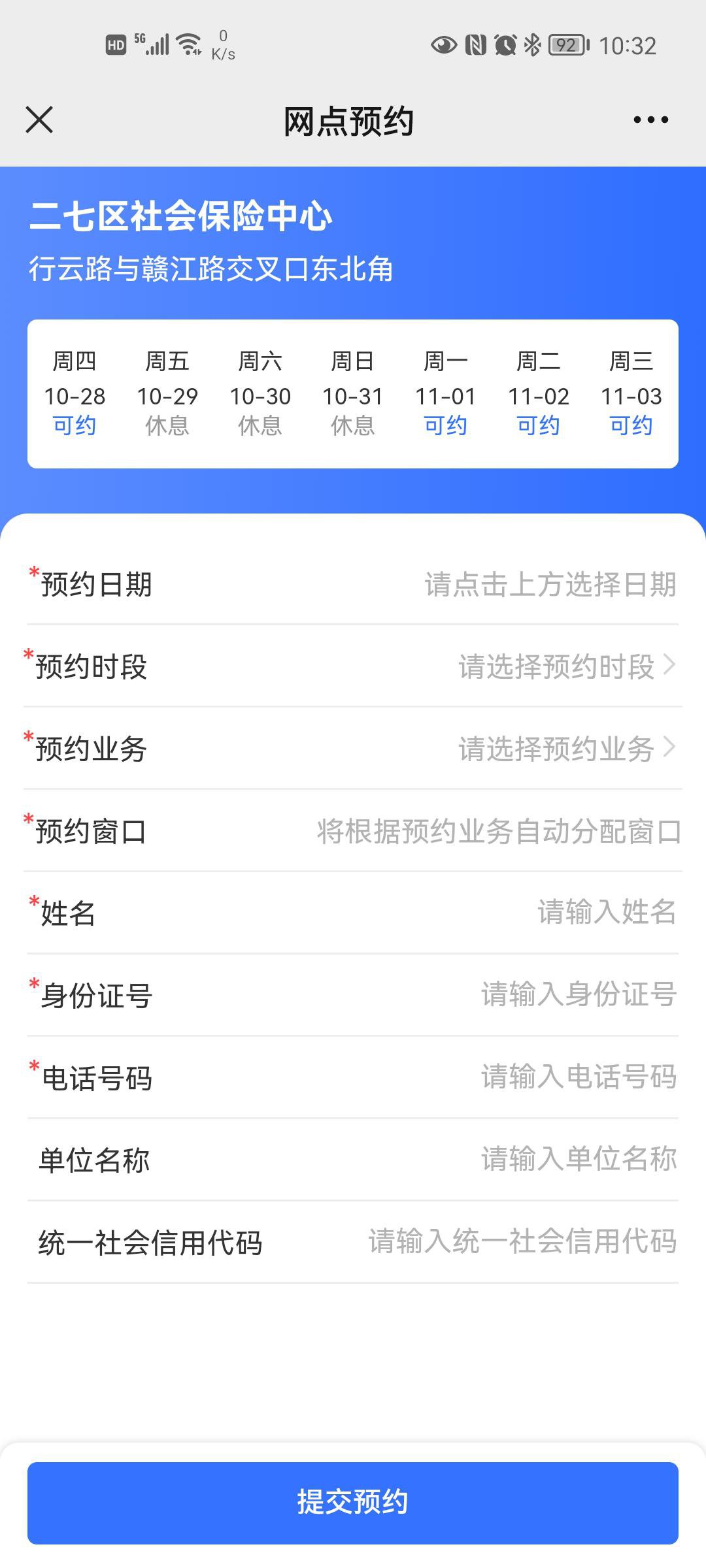 4. 点击“去预约”按钮,即可跳转到预约信息填写界面。上方选择预约的日期、选择办理的业务、时段、业务类型,填写预约人姓名、身份证号、电话号码、单位名称(非必填)、统一社会信用代码(非必填),点击“提交预约”。