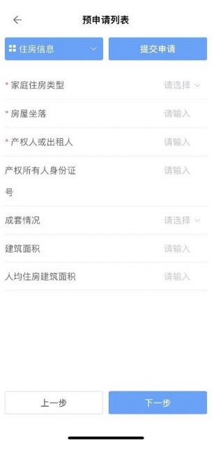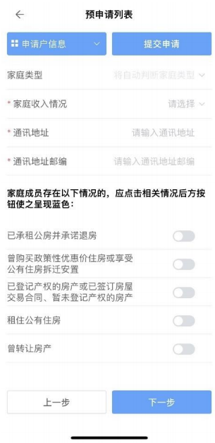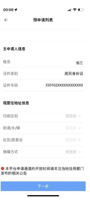 选择本次线上预申请的受理机构以及主申请人的户籍情况、保障方式。