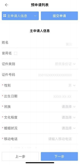 按照实际情况填写主申请人的相关信息后,点击页面下方的“下一步”按钮进行保存。