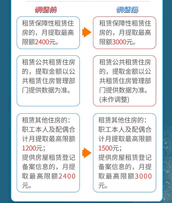 1、租赁保障性租赁住房的,职工本人及配偶每月合计提取最高限额由2400元调整为3000元。
